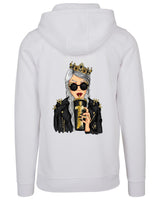 Elegant. Royal. Und kompromisslos cool. Der KOROLEVA SOLO HOODIE zeigt eine moderne Königin mit goldener Krone, Sonnenbrille und Coffee-to-go – selbstbewusst, unangepasst und absolut ikonisch. Ein Statement zwischen Urban Art, Attitude und Selbstinszenierung.