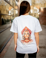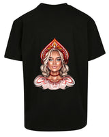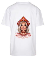 ✔ Ausdrucksstarker Rückenprint – Die blonde Madame mit rotem Kopfschmuck wirkt königlich und gleichzeitig modern.